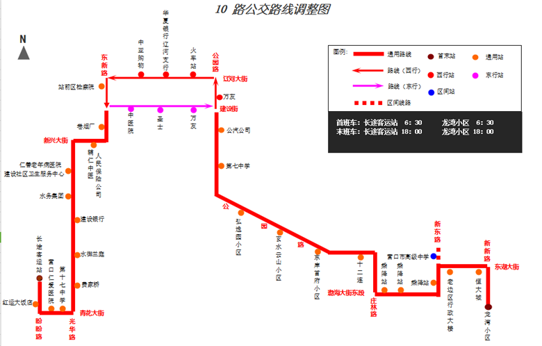 調(diào)整后:“龍灣小區(qū)”—東湖大街 —“乘降站”—新東路—原線—遼河大街/建設(shè)街—原線—盼盼路—“長途客運站”。